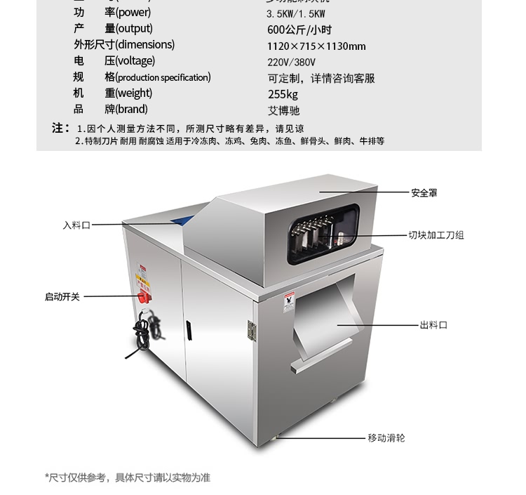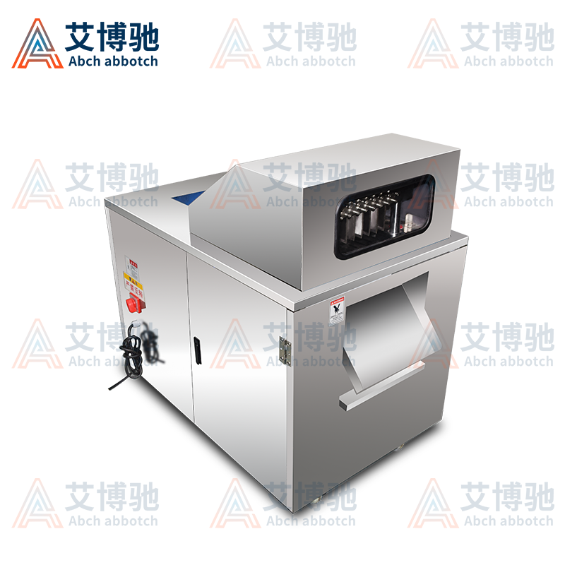 艾博馳ABCH-13A禽肉類剁塊機適合禽類,魚類的剁塊,剁段需求,輸送裝置采用單片食品級PE材質(zhì)膠板設(shè)計,可單片更換,非常方便,壓料輸送裝置采用針式鏈條設(shè)計,有效防止物料打滑后退或輸送不均勻等弊端。丁刀組丁刀刀距寬度可定制規(guī)格(2cm、2.5cm、3cm、3.5cm)等,標配3CM,最小2cm,實際成品小于丁刀刀距0.2cm,長短1cm-5cm可調(diào),物料需冷凍,效果更佳!