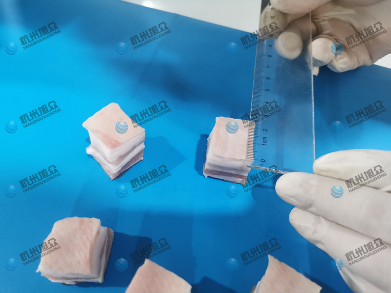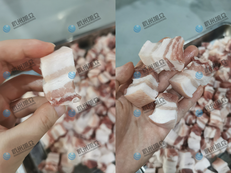 這款機(jī)器外形尺寸是1700*780*1310mm,傳送帶寬度(入料)約為500mm , 入料高度約為100mm,加工尺寸6-50mm(可定制),生產(chǎn)能力每小時(shí)可約切割1500-2000Kg,產(chǎn)量巨大,適合很多大型肉制品加工廠使用,可以節(jié)約大量人力去切肉,省去很多成本,還不會(huì)有人員受傷情況的發(fā)生。非常安全高效,下面是我們?cè)嚈C(jī)的成果展示: