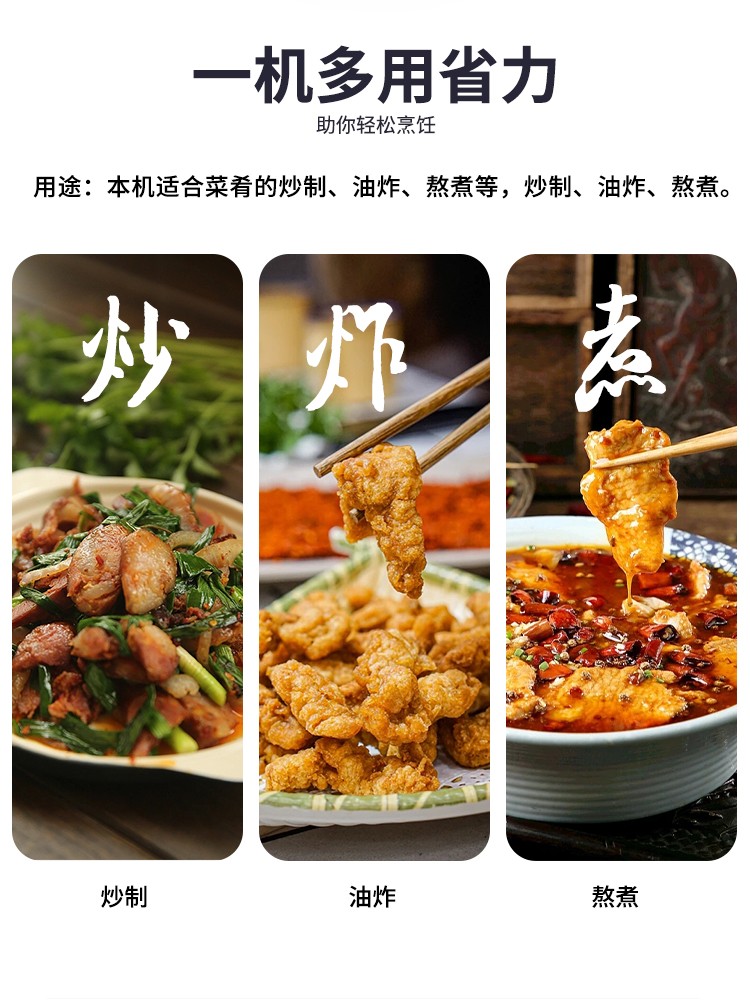 7、用途:本機(jī)適合菜肴的炒制、油炸、熬煮等,被廣泛用于餐飲、食品加工、鹵制品、調(diào)味品加工、休閑食品、烘焙、醫(yī)藥行業(yè)等領(lǐng)域。